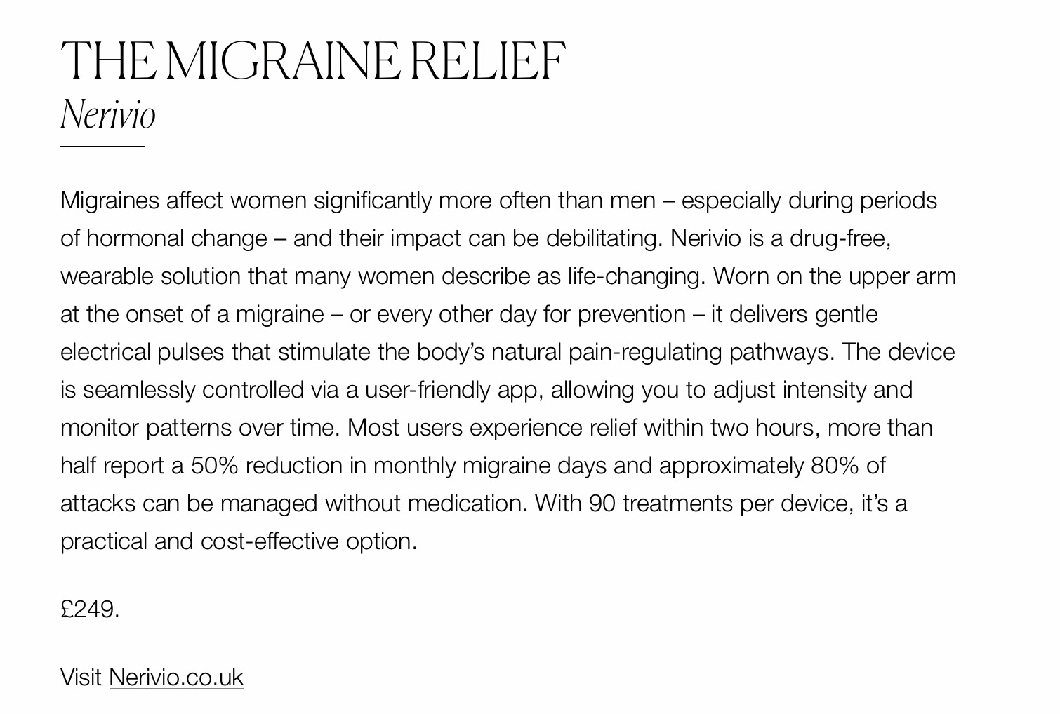 Throughout this project, our team secured national coverage on ITV’s Lorraine, in The Independent on two occasions, MSN and The Daily Star, alongside wider consumer coverage such as SheerLuxe, Take A Break, The People’s Friend, and regional titles including Bristol Live and The Liverpool Echo. Our organic social media programme featured influencers reviewing the Nerivio product, discussing its benefits as a drug-free option for migraine sufferers and showcasing the product’s tech capabilities through its app.